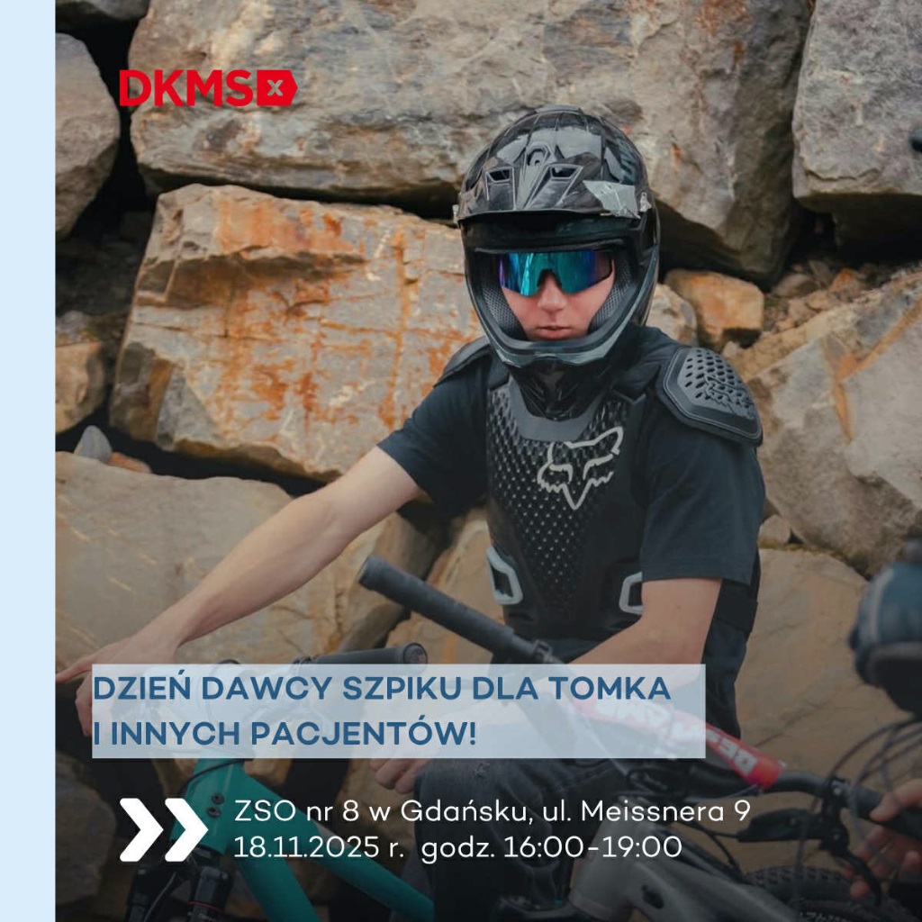 Tomek ma 15 lat i pochodzi z Gdańska. Jeszcze niedawno uczył się w technikum, a czas wolny spędzał w bikeparkach. Potem przyszła diagnoza: ostra białaczka szpikowa. Nagle całe jego życie zatrzymało się. Jego jedyna szansa na wyzdrowienie to przeszczepienie szpiku. Potrzebuje dawcy.
