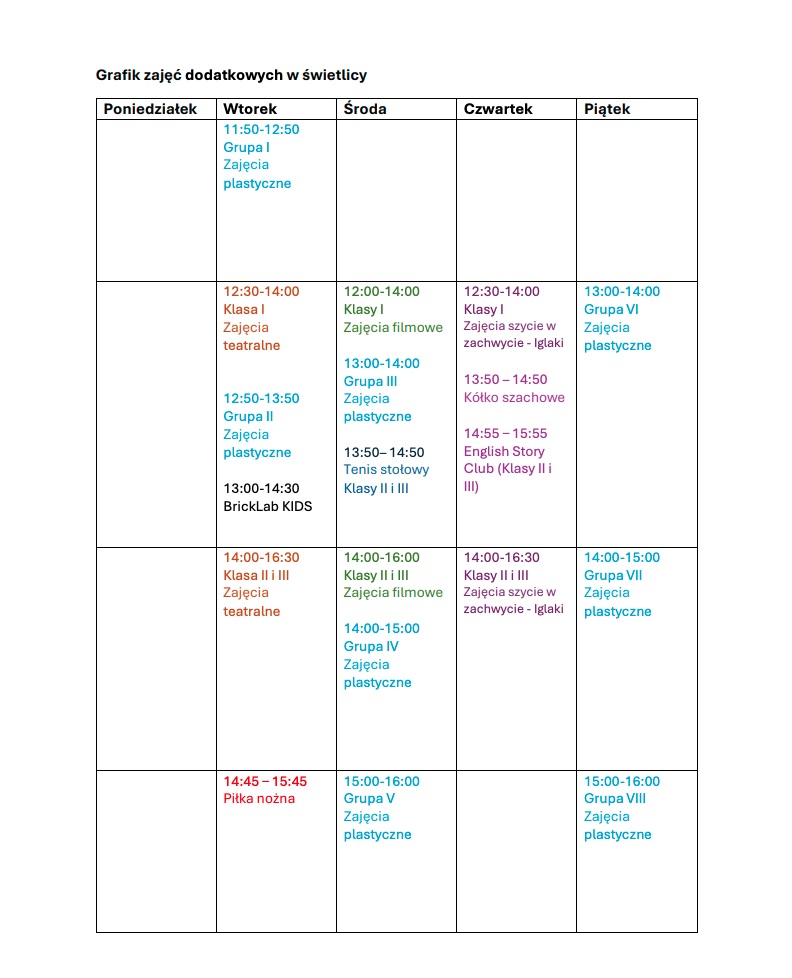 Grafik zajęć dodatkowych w świetlicy